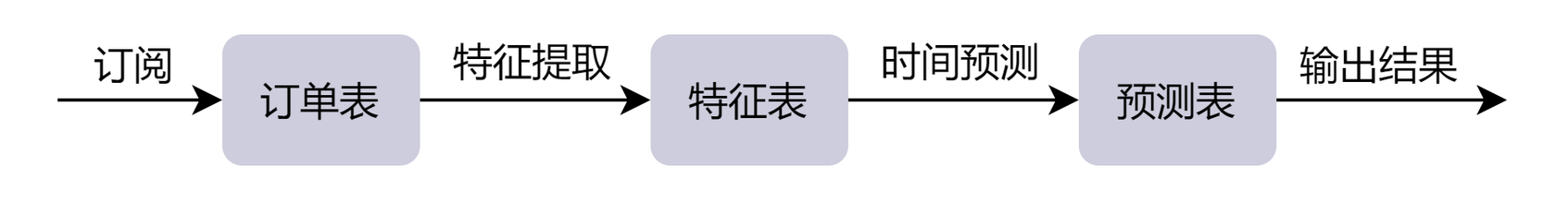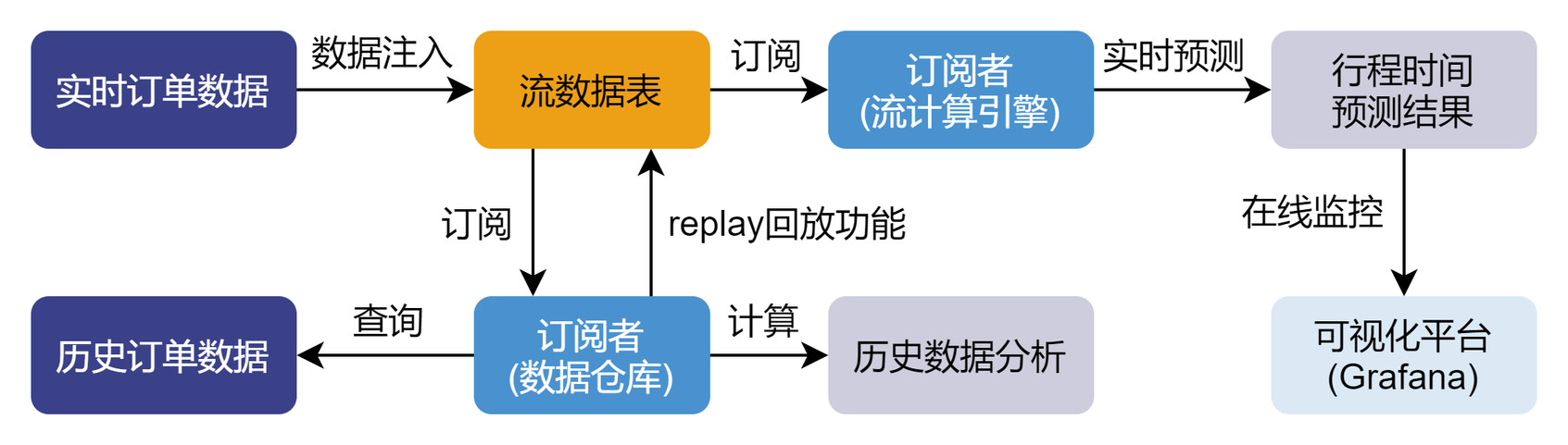 为获取行程数据并使用机器学习模型预测行程时间,用户需要创建三个流数据表实现实时预测,一是创建订单信息表订阅乘客行程信息,二是创建特征表完成对订单信息的特征提取;三是创建预测表预测特征流数据表发送的行程特征信息,输出预测结果。