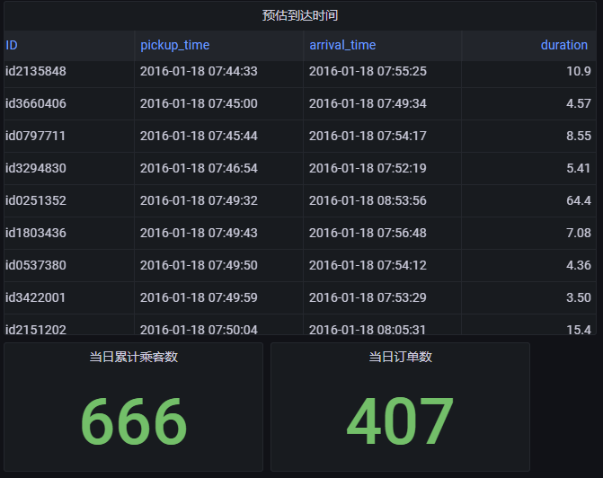 select id as ID, pickup_datetime as pickup_time, (pickup_datetime+int((exp(duration)-1))) as arrival_time, (exp(duration)-1)/60 as duration from predictTable where date(predictTable.pickup_datetime) == date(select max(pickup_datetime) from predictTable)Query 2:统计当日累计订单数及累计乘客数