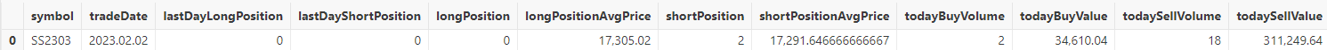 回测运行结束之后,可以通过相应的接口获取每日持仓、每日权益、收益概述、成交明细和策略中用户自定义的逻辑上下文。回测插件提供的完整回测结果接口可以参阅回测插件的接口说明文档。下图为本例获得的每日持仓数据: