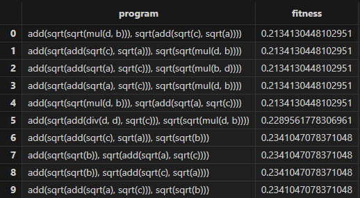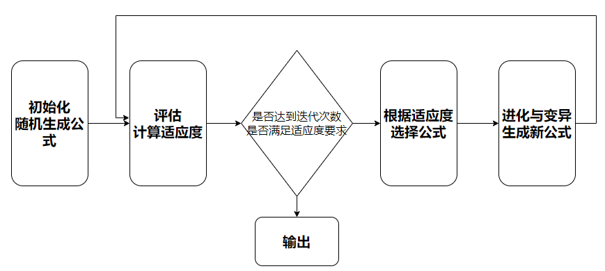 - 进化与变异:随机选取两个公式,然后从一个公式中选取一部分,与另一个公式的一部分交换,生成两个新的公式。或随机更改一部分公式,产生一个新的公式。