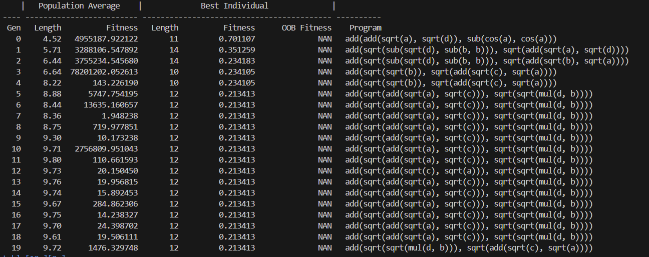 - 评估:评估每个公式的适应度(即对数据拟合的准确性),给出适应度评分。