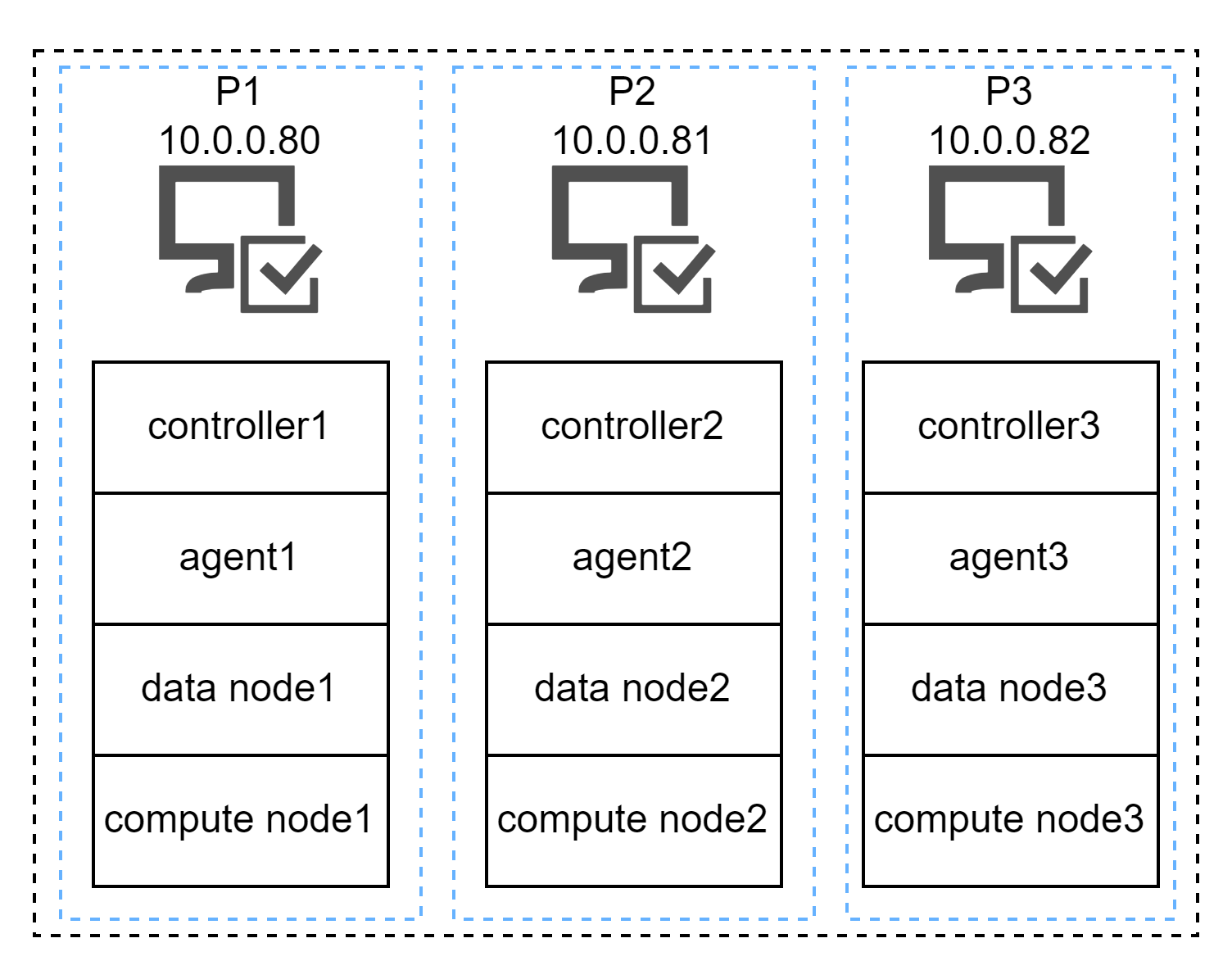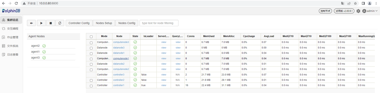 vim ./cluster.nodeslocalSite,mode 10.0.0.80:8800:controller1,controller 10.0.0.81:8800:controller2,controller 10.0.0.82:8800:controller3,controller 10.0.0.80:8801:agent1,agent 10.0.0.80:8802:datanode1,datanode 10.0.0.80:8803:computenode1,computenode 10.0.0.81:8801:agent2,agent 10.0.0.81:8802:datanode2,datanode 10.0.0.81:8803:computenode2,computenode 10.0.0.82:8801:agent3,agent 10.0.0.82:8802:datanode3,datanode 10.0.0.82:8803:computenode3,computenode注意:服务器 P1, P2 和 P3 的 cluster.nodes 配置必须完全相同。