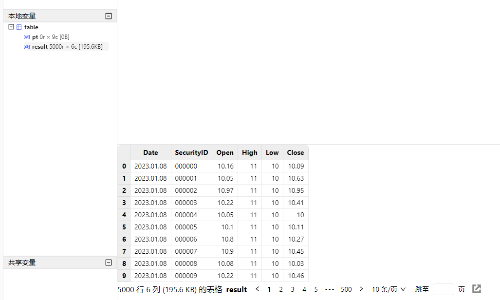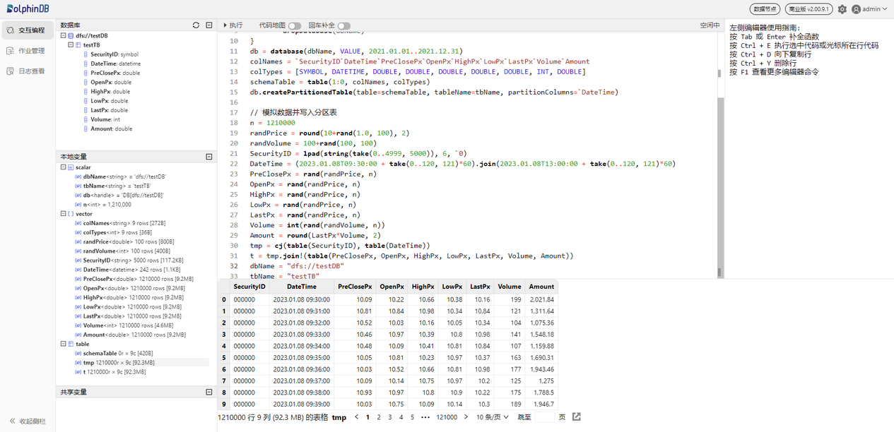 db.createPartitionedTable(table=schemaTable, tableName=tbName, partitionColumns=`DateTime)然后,执行以下语句模拟生成 5000 个股票 1天的 1 分钟 K 线数据并写入上面创建的分区表: