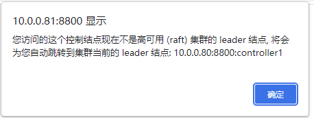 可以在 Web 管理界面启动或关闭数据节点和计算节点,以及修改集群的配置。在浏览器中输入任一控制节点的 IP 地址和端口号即可进入 Web 管理界面,例如,P2 上控制节点的 IP 为 10.0.0.81,端口号为 8800,所以访问地址为 10.0.0.81:8800,访问后可能出现如下提示,表明当前控制节点不是 leader 节点,点击确定即可自动跳转到 leader 节点: