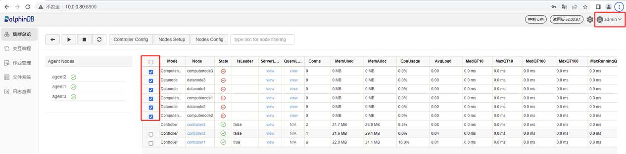 打开后的 Web 管理界面如下。以管理用身份(默认账号:admin,默认密码:123456)登录 Web 管理界面后,用户可以通过勾选想要启动的数据节点和计算节点,再点击启动(关闭)按键即可启动(关闭)相应的数据节点和计算节点: