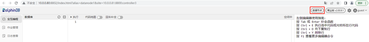 数据节点既可以存储数据,也可以用于数据的查询和计算。接下来通过一个例子介绍如何在 DolphinDB 集群数据节点创建数据库并写入数据。首先,打开控制节点的 Web 管理界面,点击对应的数据节点打开其 Web 交互编程界面,如下图所示(以 datanode1 为例):