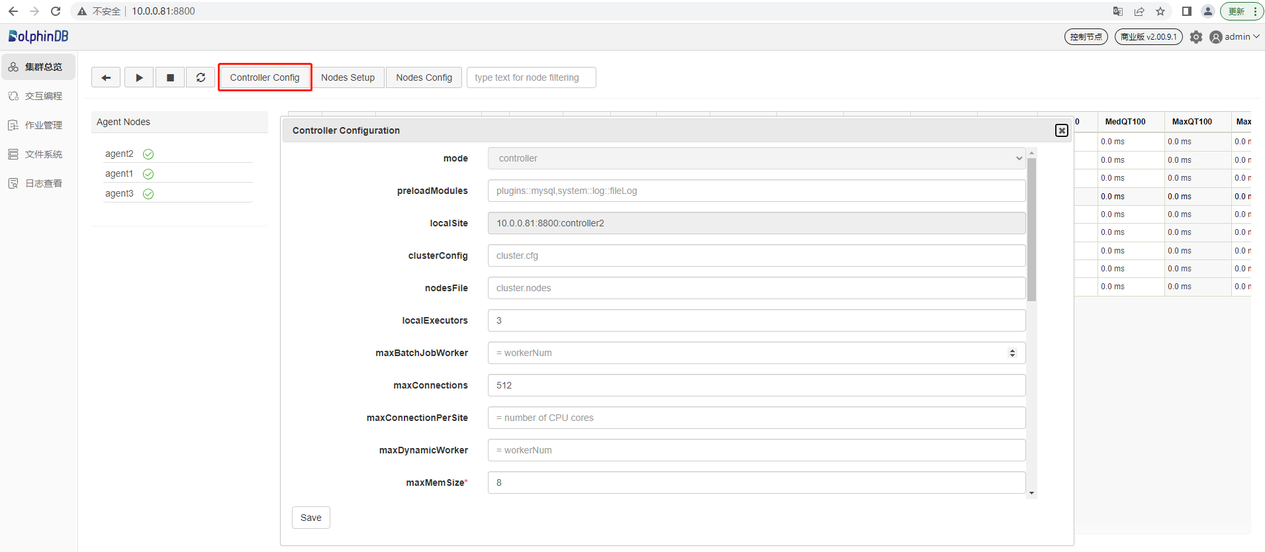 vim ./controller.cfgmode=controller localSite=10.0.0.81:8800:controller2 dfsReplicationFactor=2 dfsReplicaReliabilityLevel=1 dataSync=1 workerNum=4 maxConnections=512 maxMemSize=8 dfsHAMode=Raft lanCluster=0在这里必须修改的是 localSite,用户需要根据实际环境指定控制节点的 IP 地址、端口号和别名。 dfsHAMode=Raft 表示配置高可用集群,集群中所有的控制节点组成一个 Raft 组。dfsReplicationFactor 必须大于1。其余参数用户应结合自身服务器硬件配置进行合理参数调优。