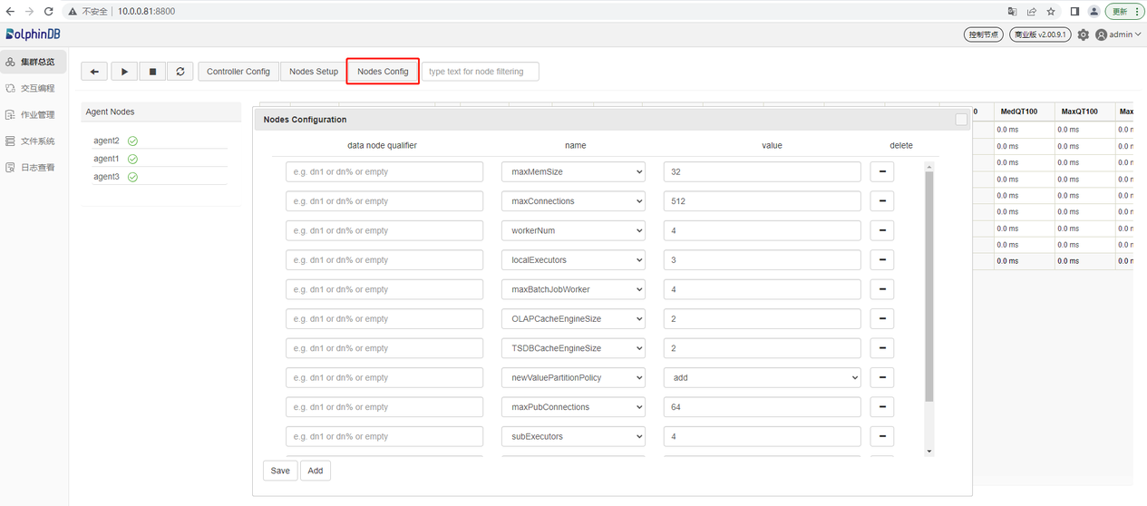 vim ./agent.cfgmode=agent localSite=10.0.0.81:8801:agent2 controllerSite=10.0.0.80:8800:controller1 sites=10.0.0.81:8801:agent2:agent,10.0.0.80:8800:controller1:controller,10.0.0.81:8800:controller2:controller,10.0.0.82:8800:controller3:controller workerNum=4 maxMemSize=4 lanCluster=0