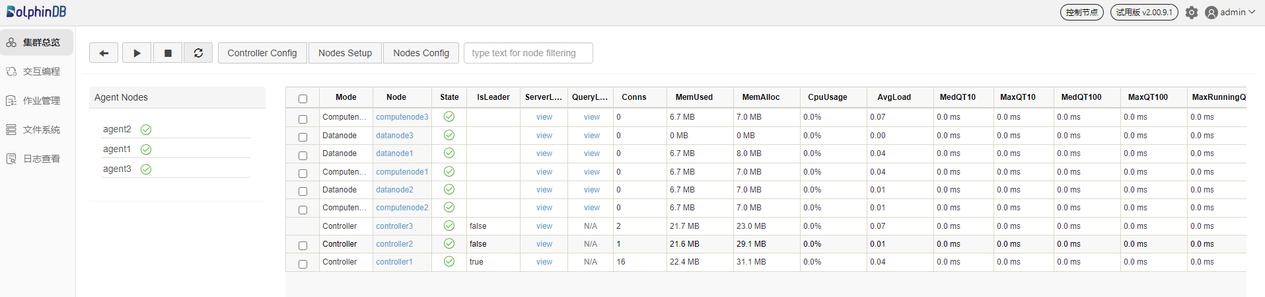 DolphinDB 集群包括四种类型节点:控制节点(controller)、代理节点(agent)、数据节点(datanode)和计算节点(compute node)。