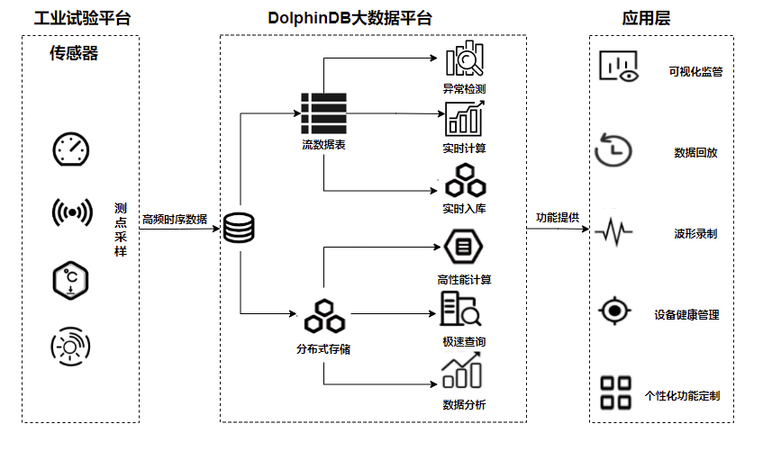 上述工业试验平台在数据存储与处理时所面临的问题,可由 DolphinDB 的数据接入、分布式存储和流计算功能为支撑,搭建以下解决方案: