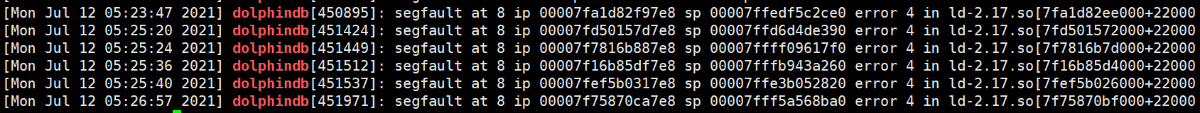 - 内存越界(数组越界,变量类型不一致等):访问到不属于 DolphinDB 的内存区域