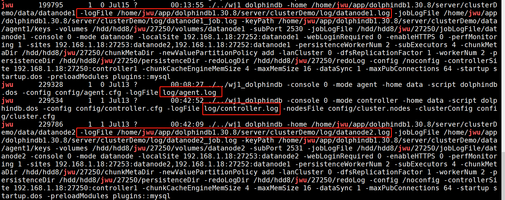 注意:节点日志存放路径为:单节点模式默认在安装目录 server 下,文件名为 dolphindb.log,集群默认在 server/log 目录下。若需要修改日志文件路径,只能在命令行中通过 logFile 配置项指定。如果集群内有节点在运行,可通过如下 ps 命令查看每一个节点对应的 log 生成位置,其中 logFile 参数表示日志文件的路径和名称: