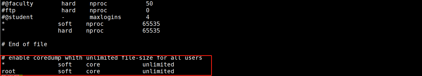 ulimit -S -c unlimited >/dev/null 2>&1后保存退出,重启 server;或者不重启 server,使用source /etc/profile使配置马上生效。/etc/profile 对所有用户有效,若想只针对某一用户有效,则修改此用户的 ~/.bashrc 或者 ~/.bash_profile 文件。 - 在 /etc/security/limits.conf 最后增加如下两行记录:为所有用户开启 core dump。