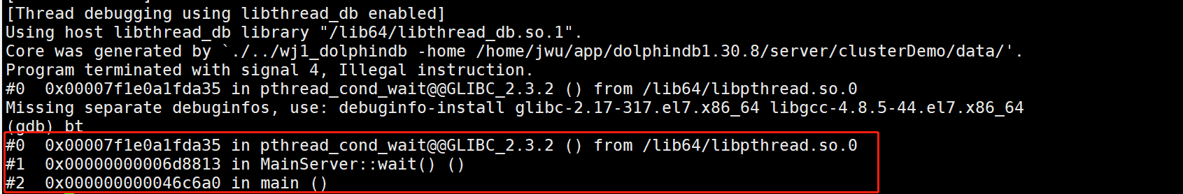 - 请查看 core 文件,用 gdb 调试获取堆栈信息。若确定系统有问题,请保存节点日志、操作系统日志和 core 文件,并及时与 DolphinDB 工程师联系。