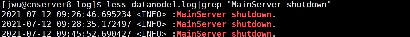 less datanode1.log|grep "MainServer shutdown"若命令执行结果显示如下图,推算系统退出的时间点也合理,可初步认定为系统主动退出。