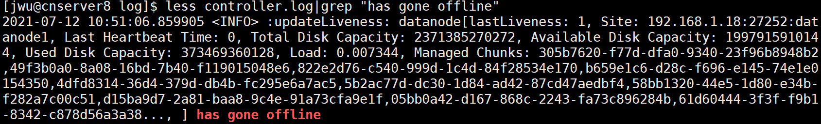 less controller.log|grep "has gone offline"