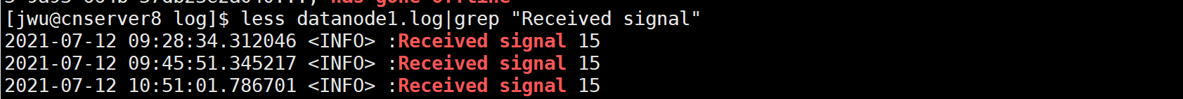 less datanode1.log|grep "Received signal"