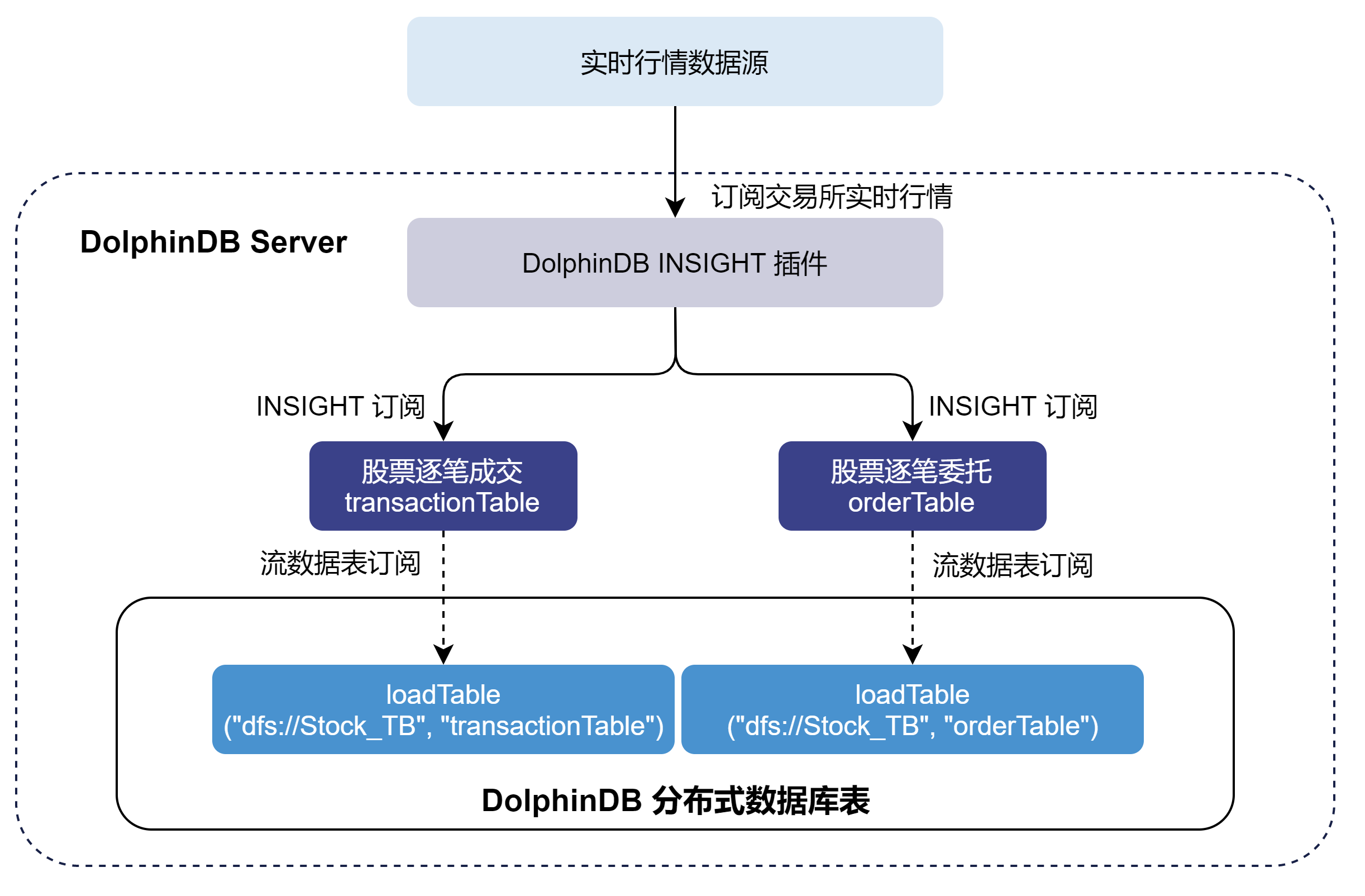 注意:请勿使用 INSIGHT 插件将行情数据直接写入分布式数据库。因为分布式数据库并不适用于此类高频的流式写入。建议在使用时,借助流数据表及其发布订阅功能以实现微批处理。这样既可以提高写入的吞吐,也有助于降低时延。
