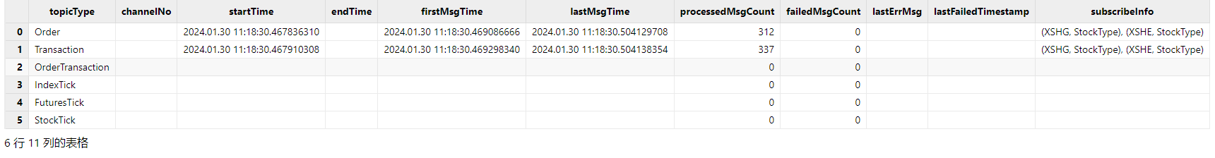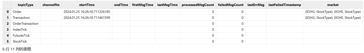 insight::subscribe(tcpClient, `MD_TRANSACTION`MD_ORDER, `XSHG, `StockType) 3.5. 查询 INSIGHT 行情接收情况