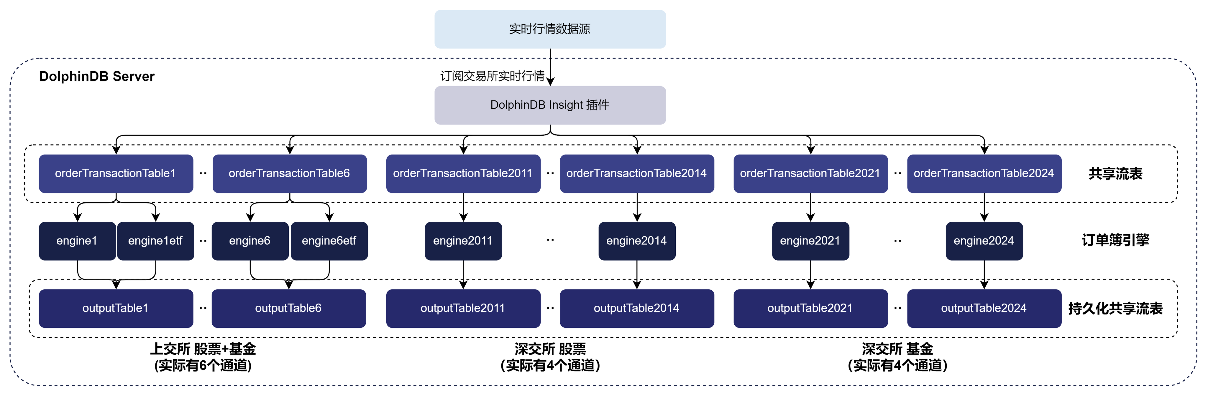 为每一个通道的逐笔数据创建一个订单簿引擎。注意,不要对一个引擎输入多个通道的数据,这可能会影响输出结果的正确性。订单簿引擎的具体工作原理和使用方式见 基于逐笔数据合成高频订单簿:DolphinDB 订单簿引擎。