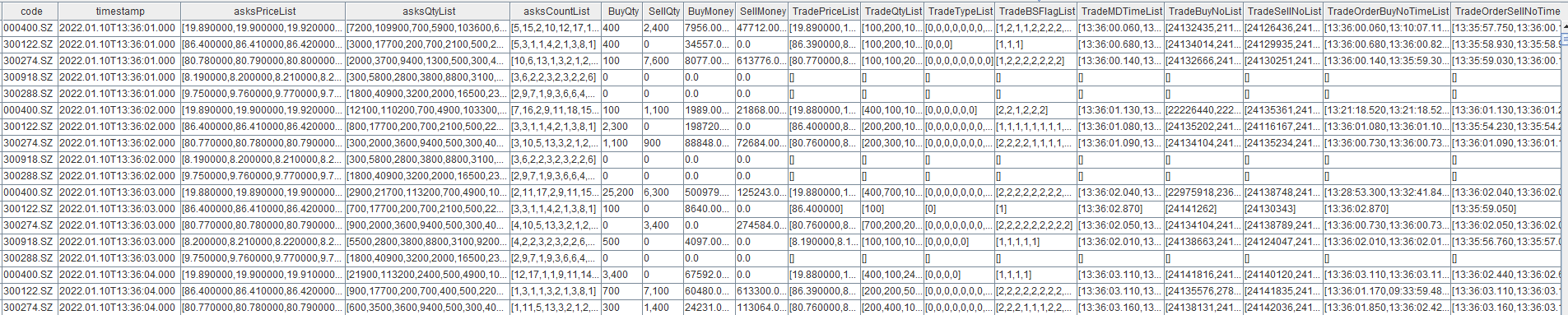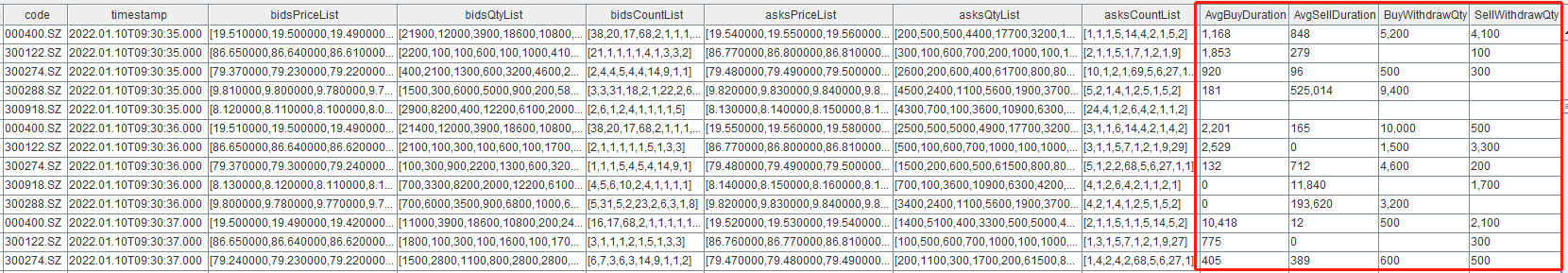 colNames = `SecurityID`timestamp`lastAppSeqNum`tradingPhaseCode`modified`turnover`volume`tradeNum`totalTurnover`totalVolume`totalTradeNum`lastPx`highPx`lowPx`ask`bid`askVol`bidVol`preClosePx`invalid join ("bids" + suffix) join ("bidVolumes" + suffix) join ("bidOrderNums" + suffix) join ("asks" + suffix) join ("askVolumes" + suffix) join ("askOrderNums" + suffix)