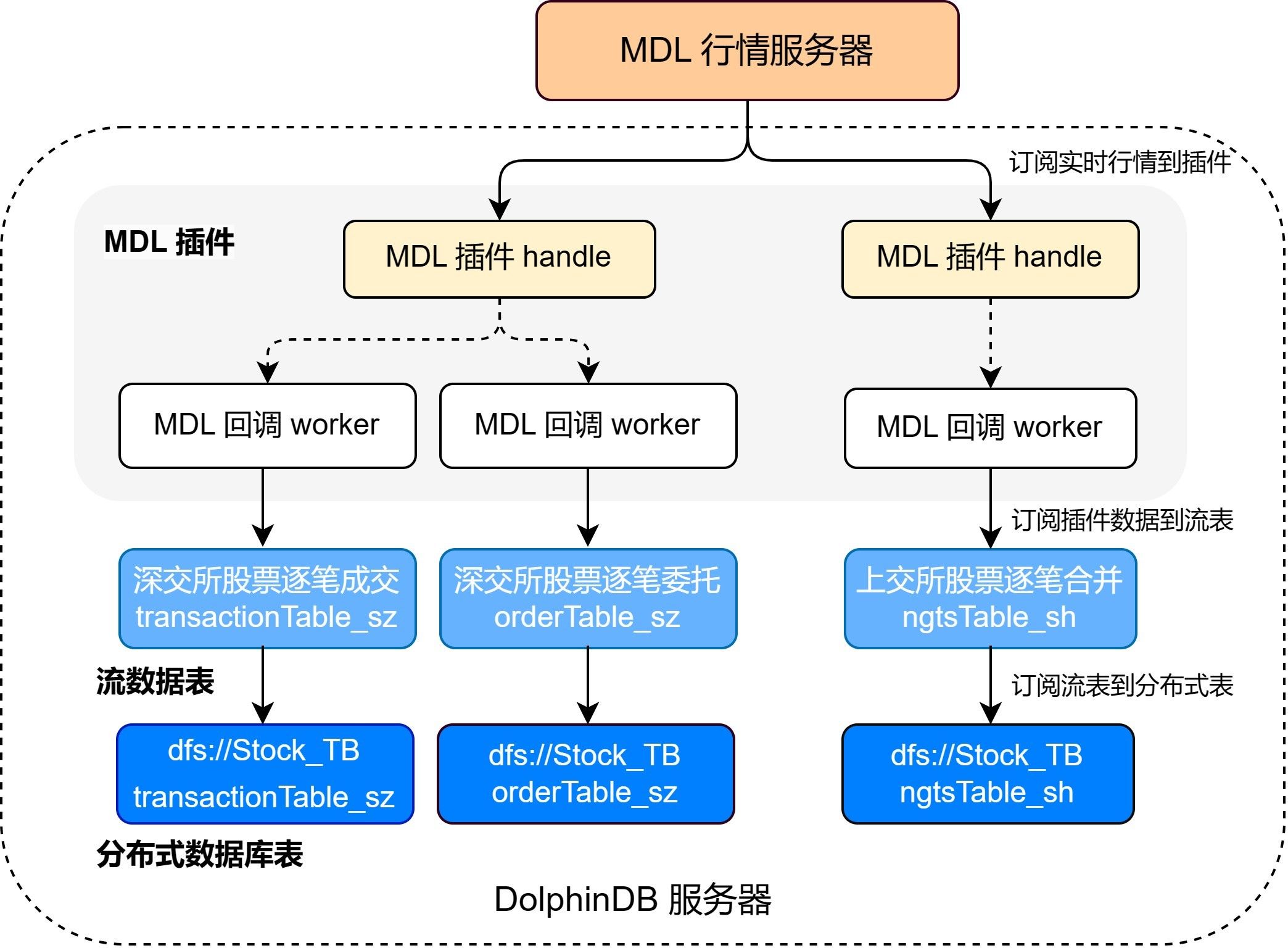 注意:请勿使用 MDL 插件将行情数据直接写入分布式数据库。因为分布式数据库并不适用于此类高频的流式写入。建议在使用时,借助流数据表及其发布订阅功能以实现部分的批处理。这样既可以提高写入的吞吐量,也有助于降低时延。