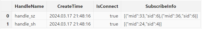 select HandleName,CreateTime,IsConnect,SubscribeInfo from stat返回结果如下,可以看到在本例提交了 MDL 订阅,订阅了深交所的逐笔成交和逐笔委托,以及上交所的逐笔合成,目前的连接状态为 true。