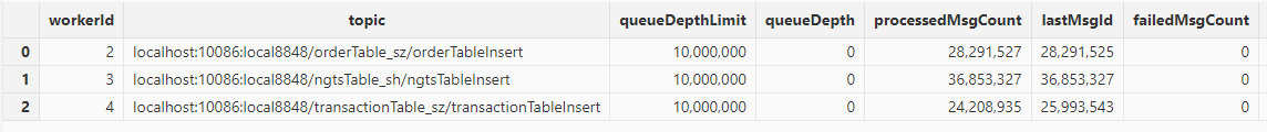 subscribeTable(tableName="ngtsTable_sh", actionName="ngtsTableInsert", offset=-1, handler=handleInsert{Ngts}, msgAsTable=true, batchSize=20000, throttle=1, reconnect=true)handleInsert自定义函数会手动新增一列新的 Date 数据,并写入当天的日期。- 通过调整 subscribeTable 函数中的 *batchSize *和 *throttle *参数可以控制写入分布式数据库的频率。