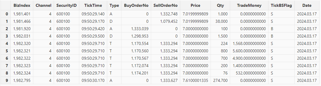查询 dfs 表中某一只股票的数据,观察数据。这里查询 600100 这支上交所股票的数据,执行以下命令,从 dfs 表中获取了从连接之后的所有该股票的逐笔数据。