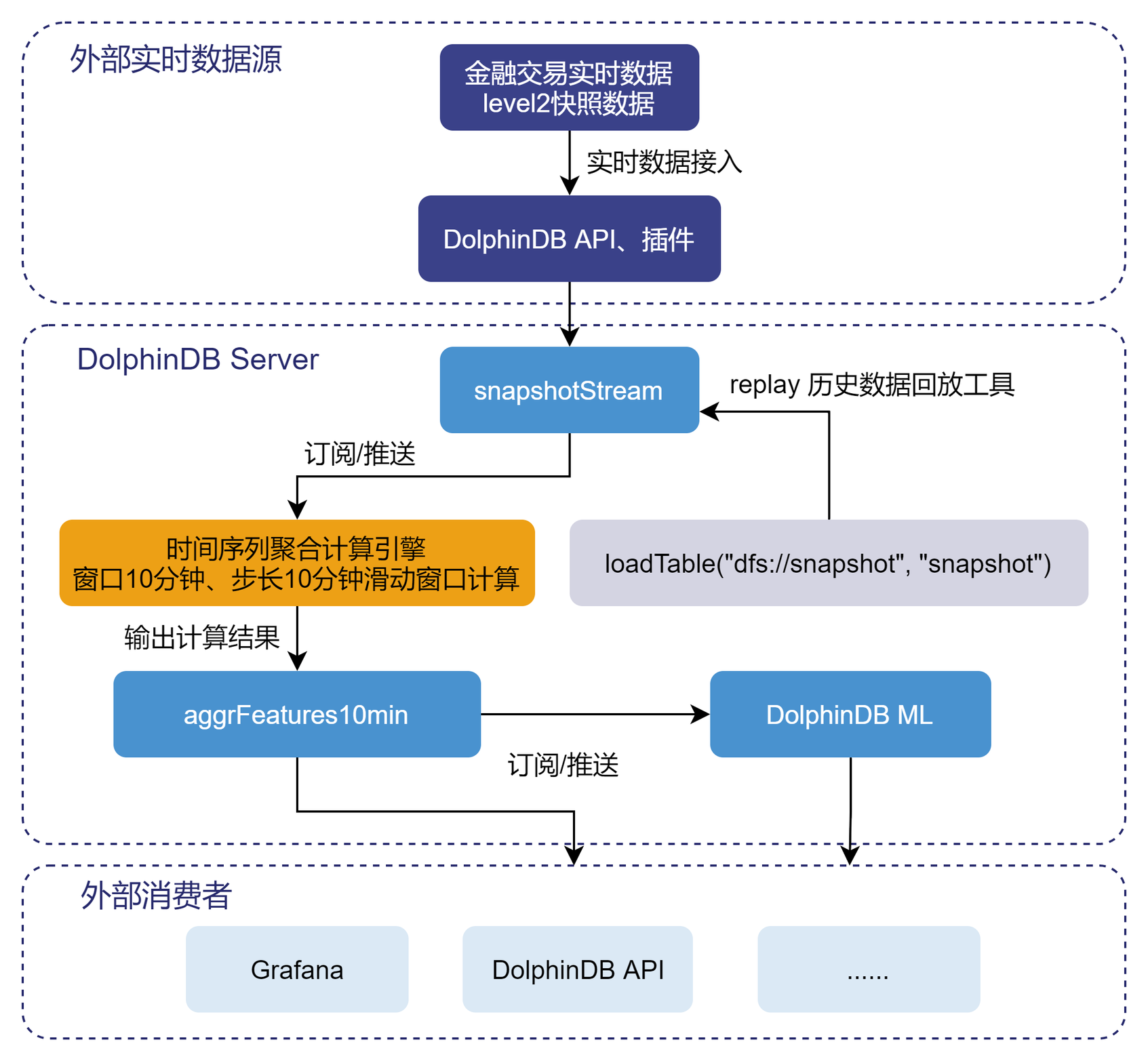 实时的流数据通过 DolphinDBAPI 注入至 snapshotStream表中,然后通过订阅/推送,将快照数据注入至时间序列聚合引擎,进行窗口为 10 分钟,步长为 10 分钟的滑动窗口计算。核心代码如下::