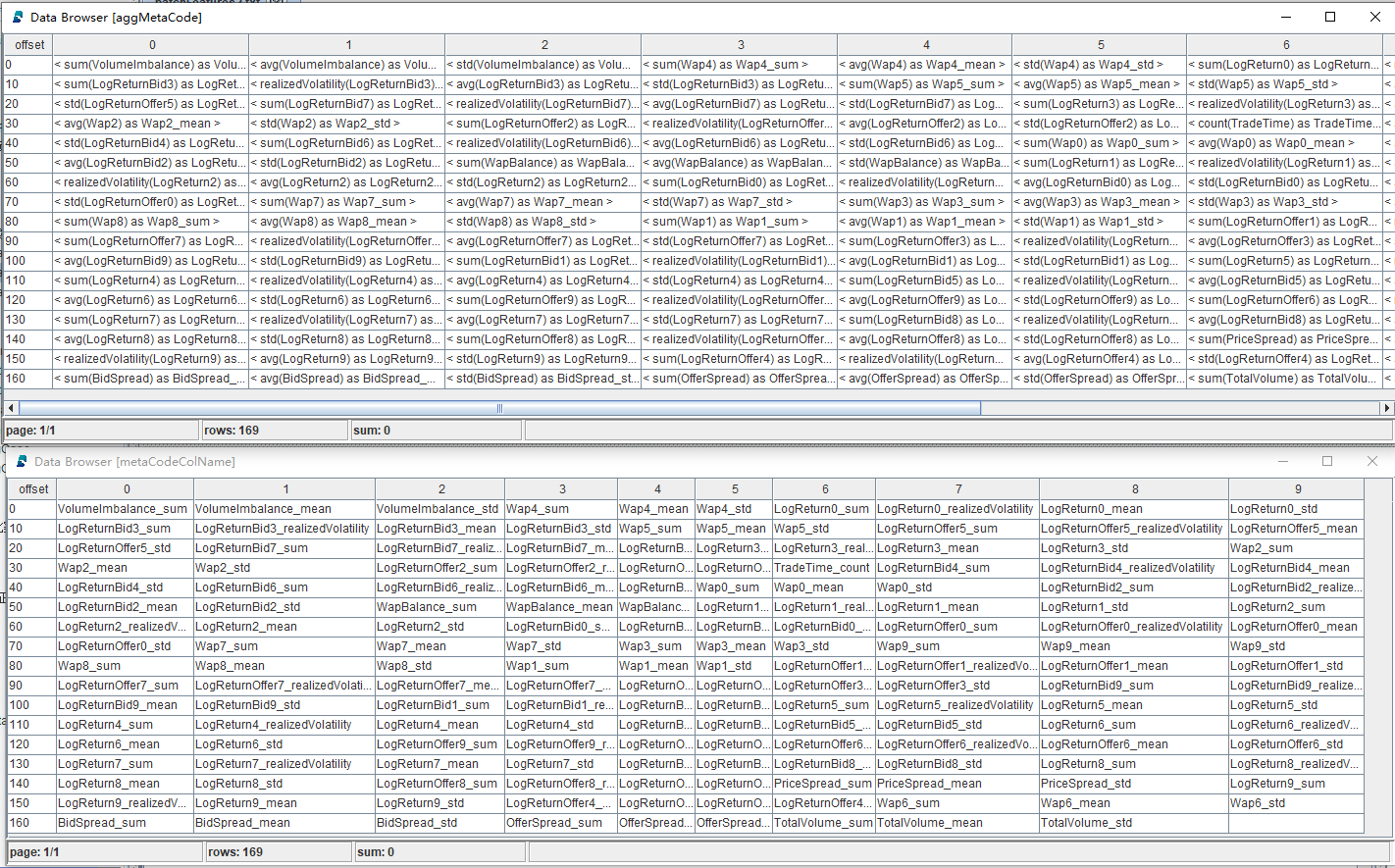 aggMetaCode, metaCodeColName = createAggMetaCode(features)返回结果为元代码向量和对应的元代码列名,如下图所示: