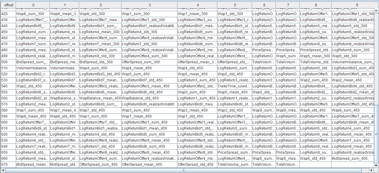 | LogReturnOffer[10] | sum, realizedVolatility, mean, std |