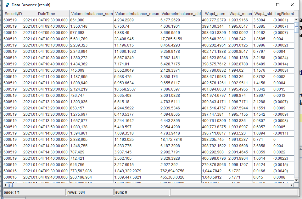 subTable = table(DateTime as `DateTime, BidPrice, BidOrderQty, OfferPrice, OfferOrderQty, wap, wapBalance, priceSpread, BidSpread, OfferSpread, totalVolume, volumeImbalance, LogReturnWap, LogReturnOffer, LogReturnBid)