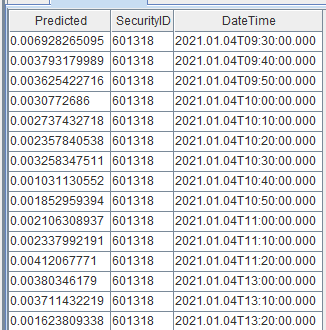 test_x = select * from aggrFeatures10min timer{ temp_table = select SecurityID, DateTime from test_x test_x.update!(`SecurityID_int, int(test_x[`SecurityID])).dropColumns!(`SecurityID`DateTime`LogReturn0_realizedVolatility) Predicted = xgboost::predict(model , test_x) }统计结果: