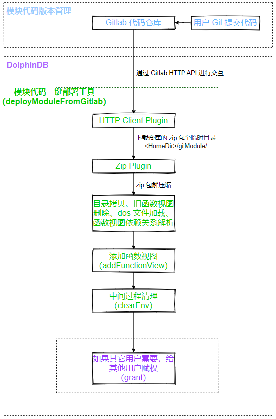 在框架图中,模块代码一键部署工具部分(绿色)为了简化业务人员使用,降低出错风险,已封装成一个函数视图(deployModuleFromGitLab)。运维人员部署该函数视图,并赋予业务人员执行权限。业务人员调用该函数视图,即可对 GitLab 中的模块代码进行一键部署。
