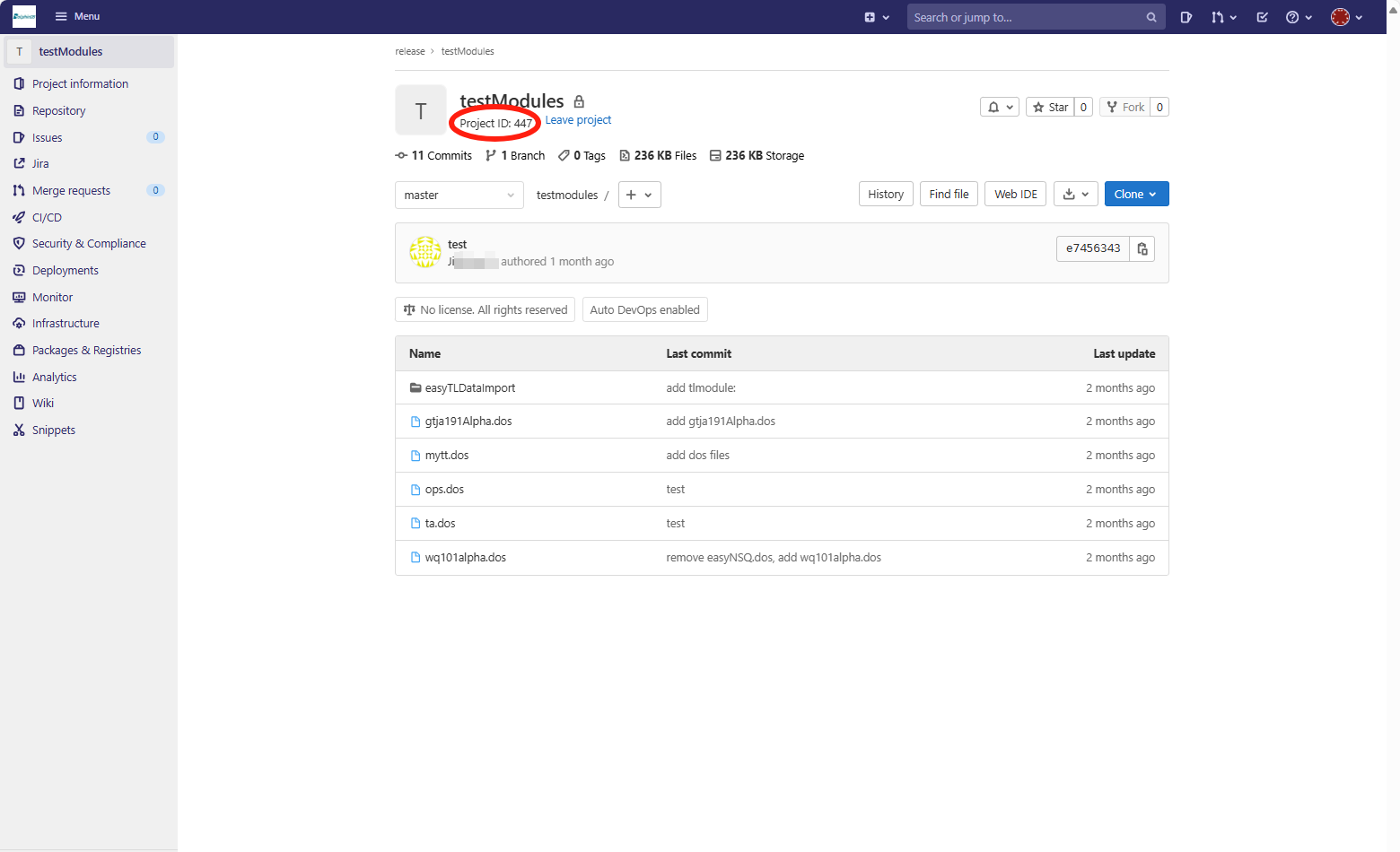 首先,如果为第一次部署某仓库模块代码,需要先获取该仓库的 Project ID 与生成个人访问 Token。