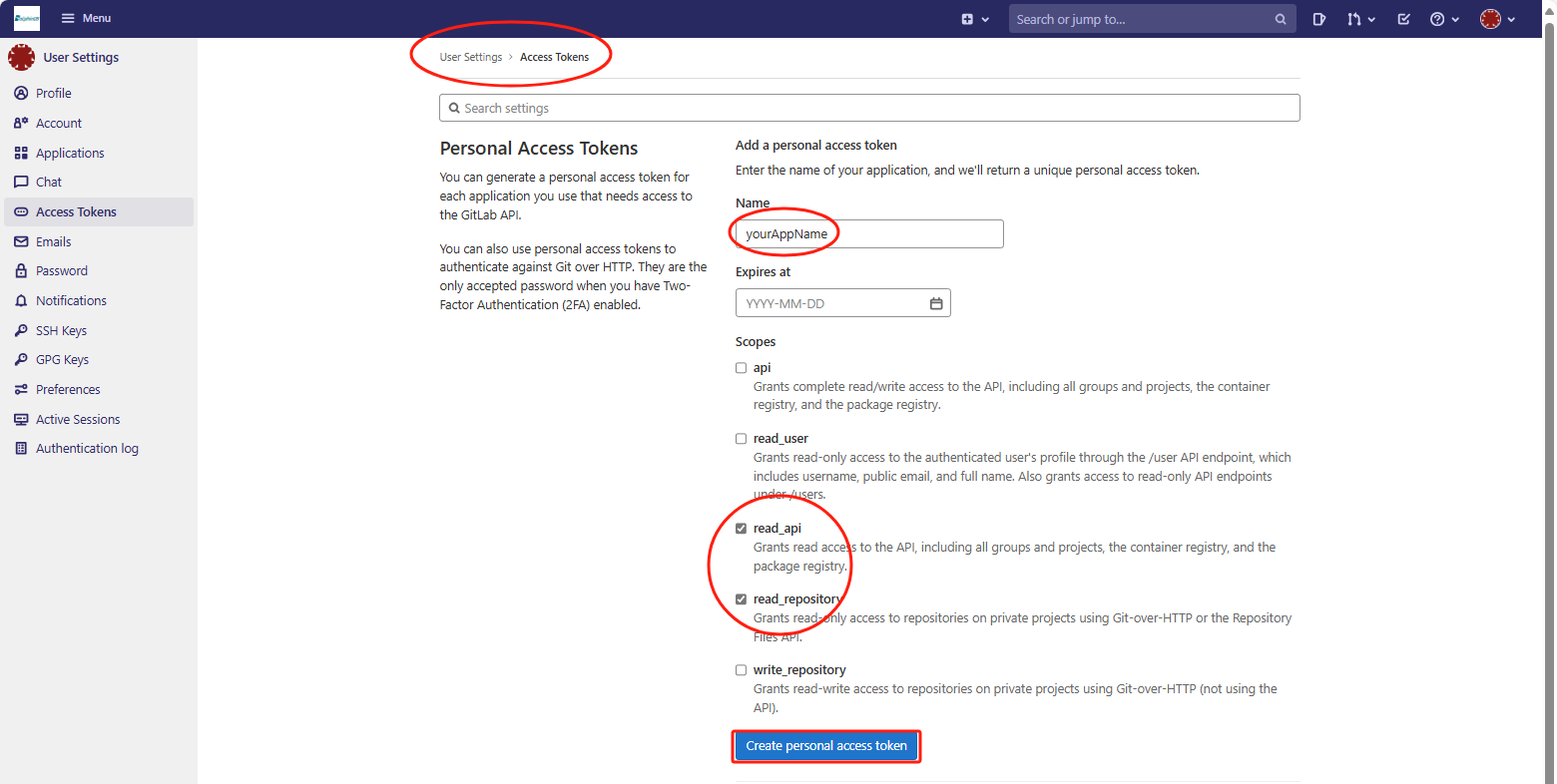 个人访问令牌可以在 User Settings → Access Tokens 中生成,如下图所示。更详细地,可以参考 Gitlab 官方 Project access tokens 。