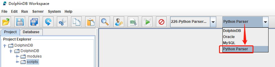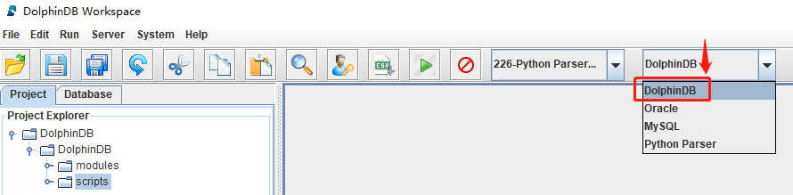上述教程代码都基于 DolphinDB 语法开发,在 DolphinDB 支持的编程 IDE 中执行代码时要选择 DolphinDB 语法解释器。选择方式如下: