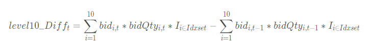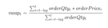 其中 vwapt 表示 t 时刻起的前 lag 笔委托单的委托量加权平均委托价格;orderQtyi 表示 i 时刻委托单的委托量;orderPricei 表示 i 时刻委托单的委托价格。