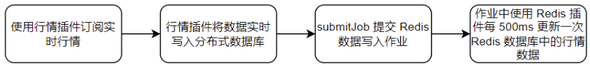 本小节以将行情插件实时订阅的行情数据实时写入 Redis 数据库为例,对 Redis 插件的使用进行说明,整体流程如下图: