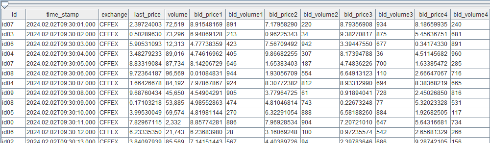 cffex_data = select * from loadTable("dfs://CFFEX", "CFFEX_PRICE") context by id order by time_stamp limit -1