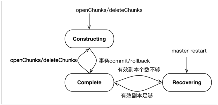 CONSTRUCTING: chunk 正在构建中,比如 openchunk 后正在写入,正在删除等,一般是事务中的状态。RECOVERING: chunk 处于恢复中,当 Controller 刚启动,chunk 都处在这个状态,等待 Data Node 汇报版本,如果版本和 Controller 上的版本一致,则状态由 RECOVERING 变为 COMPLETE 状态。 其次,如果 Data Node 汇报上来的版本不一致,那么 Controller 上的 chunk 会一直处在这种状态,直到 recovery 过程完成,然后版本变为一致,状态变为 COMPLETE。 除了 Controller 刚启动,在正常运行中,也可能出现这种状态。例如,在读数据的时候,检查到数据校验错误,Data Node 会向 Controller 发起 recovery 请求,在 Controller 执行 recovery 的过程中,chunk 的状态也是 RECOVERING。COMPLETE: chunk 处于完成状态,事务正常完成,重启后版本一致,都将处在这个状态,这个状态是最终正确的状态。