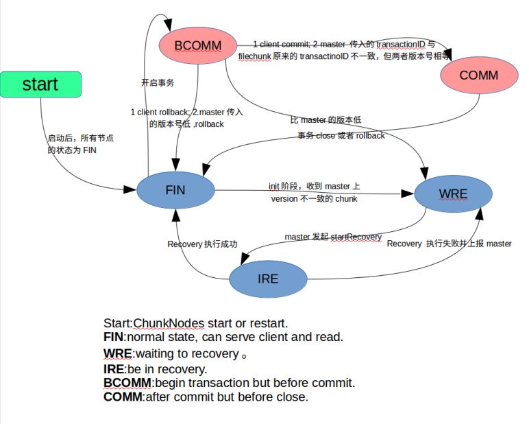 FIN:chunk处于终态,包括事务最终正确完成,或者 rollback。BCOMM: before commit, 往一个 chunk 上正在执行事务,在 commit 之前的阶段。比如正在写数据或者删除数据。COMM: after commit,事务已经 commit 的状态。WRE: waiting for recovering,等待恢复的状态,比如版本不一致或者数据损坏,向 Controller 发起 recovery 请求后,等待 Controller 发起 recovery 之前,则会处于这种状态。IRE: in recovering 状态,在 recovering 状态中,接受到 Controller 的recovering请求,开始启动recovery,则处于这个状态,recovering 完成后变为 FIN 状态。