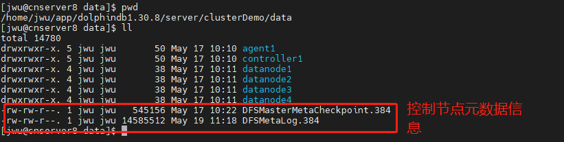 restoreControllerMetaFromChunkNode 函数主要用于恢复元数据,需要在控制节点上执行;该函数执行时,元数据存储目录下必须为空,所以需要在 controller.cfg 中配置元数据存储位置,将用于配置元数据存储路径的参数 dfsMetaDir 设置为空。控制节点的元数据文件如下:
