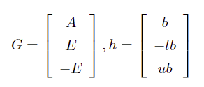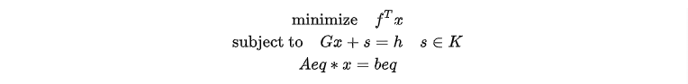 注意:记 l 为表示非负象限约束的维度的整数标量, 即线性不等式的维度;q 为表示各个二阶锥约束的维度大小的正数向量,形式为[r0, r1,…, rN-1]。注意 q 中每个二阶锥维度要 +1,因为除了二阶锥不等式约束左边的二范数维度,还要加上右端的式子。所以最后 l+sum(q) 应该等于矩阵 G 的行数。