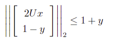 G = concatMatrix([G, concatMatrix([GY, matrix(DOUBLE, U.shape()[0], 1, , 0) ])], false) // || [2Uw, -y] +[0 , 1] ||2 <= y + 1 2U