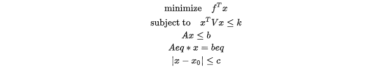 二次不等式约束问题为二次线性约束条件下的线性目标函数的最优化问题,可以直接通过 DolphinDB 中的 qclp 或转换为二阶锥问题进行求解。原问题形式为: