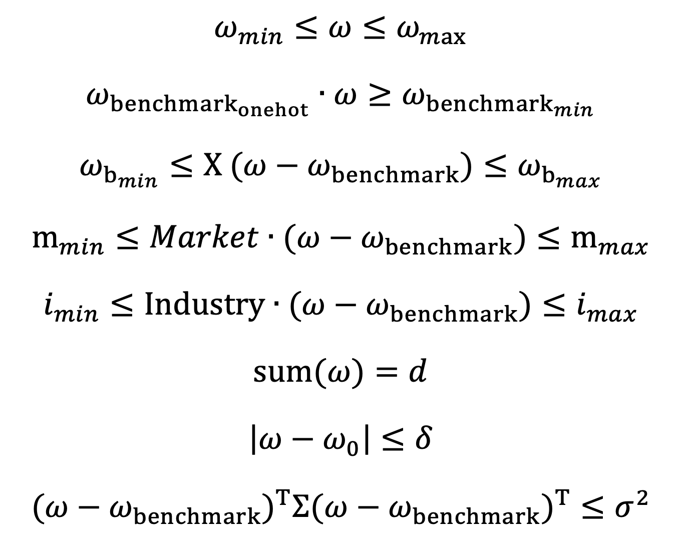 第八项约束条件为跟踪误差约束,即投资组合相对于基准波动率的限制条件,为二次不等式约束,可通过 cholesky 分解得到可以得到: