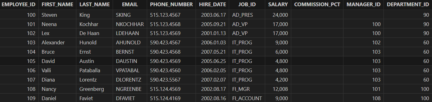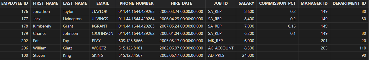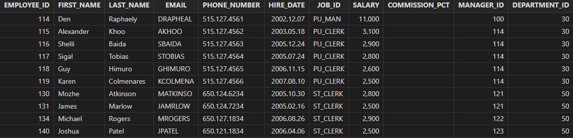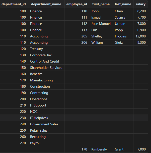 select department_id, department_name,employee_id, first_name, last_name, salary from departments left semi join employees // or left semijoin on departments.department_id = employees.department_id and employees.salary > 2500 order by department_id