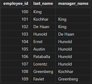 select e1.employee_id, e1.last_name, e2.last_name as manager_name from employees e1 left join employees e2 on e1.manager_id = e2.employee_id
